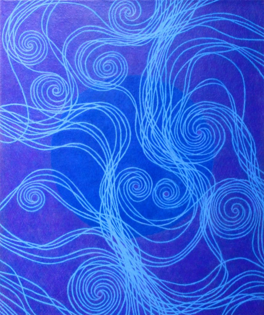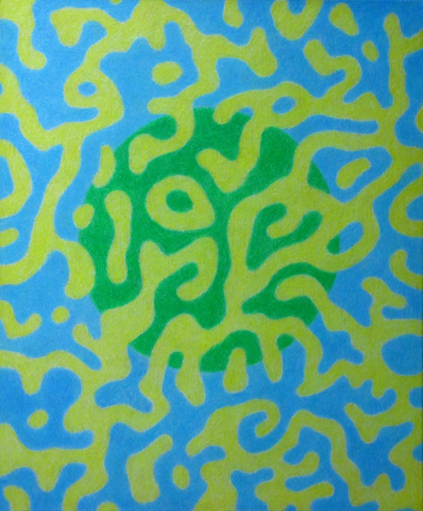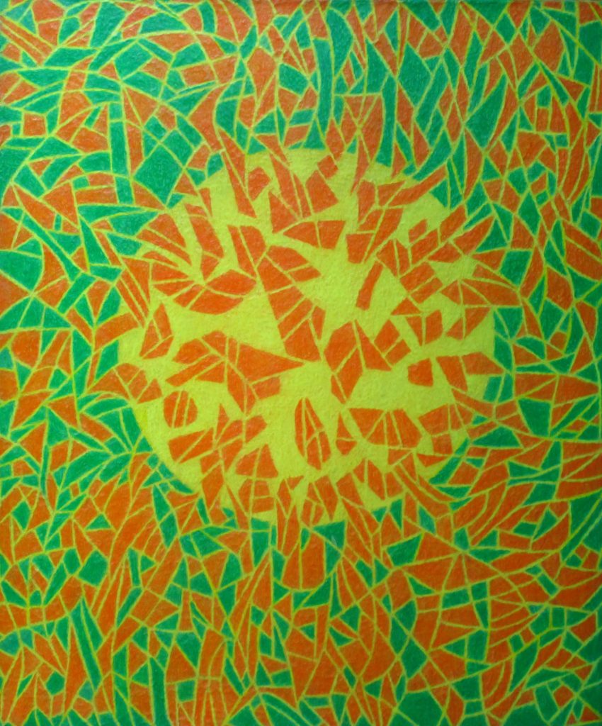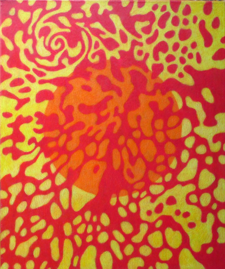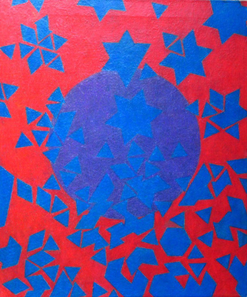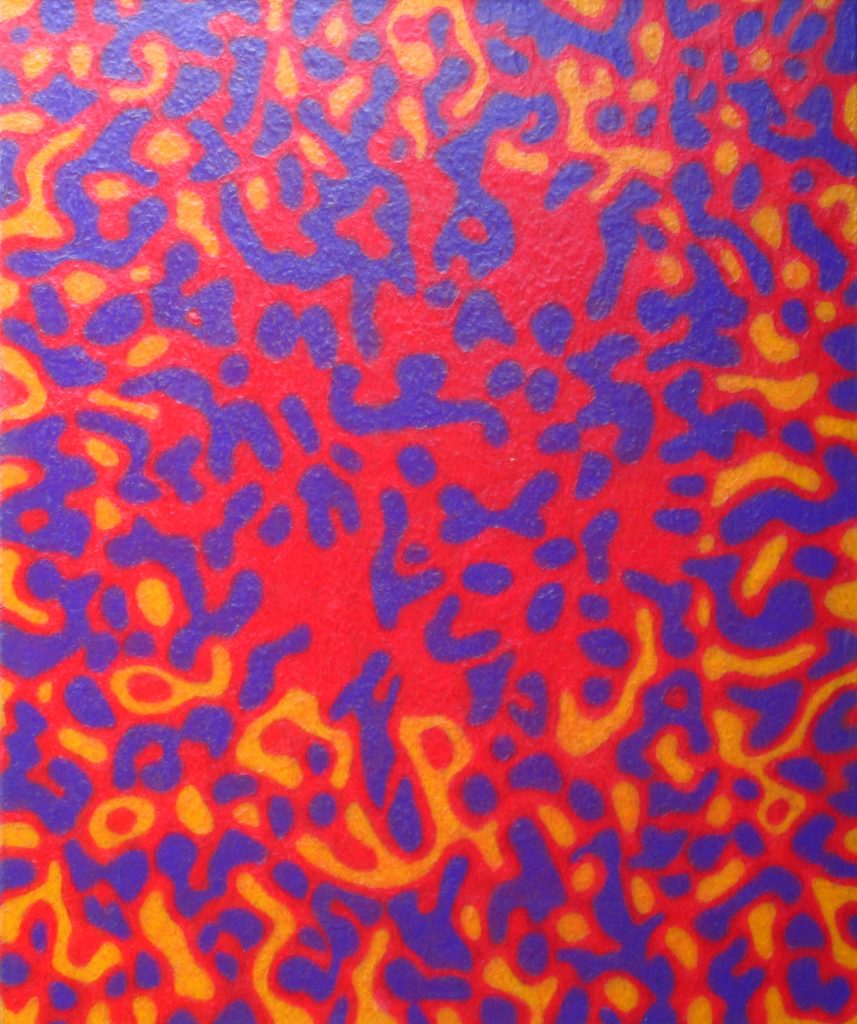 Die Bilder dieser Serie haben drei Ebenen. Der Vordergrund wird durch ein Muster gebildet, der Mittelgrund durch den Kreis, und der Hintergrund durch die Farbfläche, die „durch“ den Vordergrund, und „hinter“ dem Kreis zu sehen ist. Diese Serie umfasst sieben Bilder, und sieben Farben: Rot, Orange, Gelb, Hellblau, Dunkelblau, Violett und Grün. Auf jedem Bild erscheinen, den drei Ebenen entsprechend, drei Farben. Dabei durchwandert jede Farbe die drei Ebenen. Bei dem Bild unten, ist das Rot im Vordergrund. Beim nächsten Bild steigt das Rot in den Mittelgund hinunter, und das Violett taucht im Vordergrund auf. Bei dem dritten Bild wechselt das Rot in den Hintergrund, Das Violett geht in die Mitte, und das Dunkelblau erscheint im Vordergrund. Beim vierten Bild verschwindet das Rot aus dem Bild. Bei jedem Bild kommt also „Oben“ eine neue Farbe hinzu, und gleichzeitig verschwintet „Unten“ eine. Beim letzten Bild ist das Orange im Vordergrund. Das wandert beim ersten Bild auf die zweite Ebene. So schließt sich der Kreis.